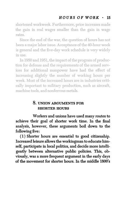 The fear of unemployment runs through much of the trade unions' justification for shorter hours. In the last half of the nineteenth century, the make-work idea was expressed in its very crudest form. The concept prevailed that there was just a given 'lump of work." Shorter hours of work meant that more men had to be found to do the job. Increased demand for workers, labor contended, drove wages up.